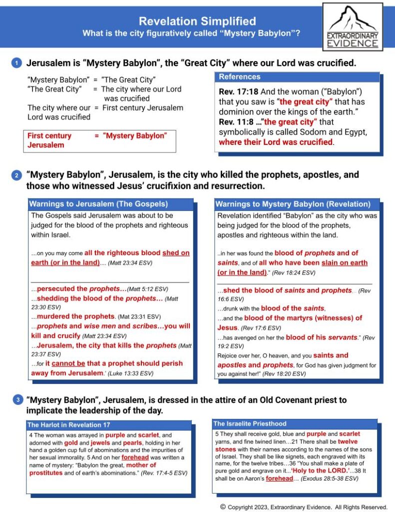 While other interpretations of Mystery Babylon exist, the weight of evidence points towards first-century Jerusalem as the most fitting candidate. The city’s history of bloodshed, its designation as “the great city” where Jesus was crucified, the symbolism of the harlot’s attire, the beast’s identification as Rome, and the fulfillment of Daniel’s prophecy all converge to support this conclusion. Understanding Mystery Babylon as first-century Jerusalem sheds light on the historical context of Revelation and the fulfillment of biblical prophecy.